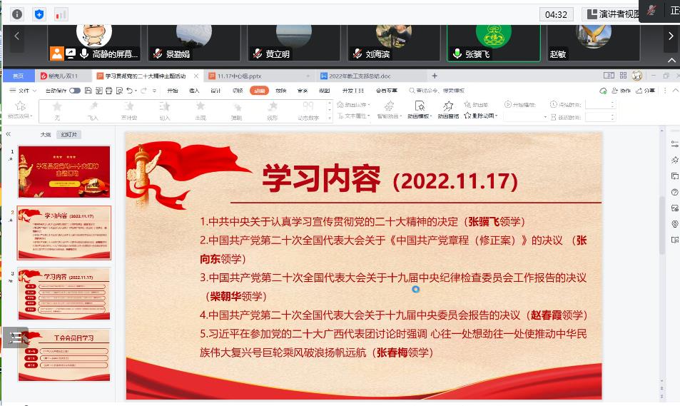 张骥飞、张向东、柴朝华、赵春霞、张春梅五位同志分别领学了《中共中央关于认真学习宣传贯彻党的二十大精神的决定》、《中国共产党第二十次全国代表大会关于<中国共产党章程(修正案)>的决议》、《中国共产党第二十次全国代表大会关于十九届中央纪律检查委员会工作报告的决议》、《中国共产党第二十次全国代表大会关于十九届中央委员会报告的决议》、习近平在参加党的二十大广西代表团讨论时的重要讲话。集中学习后,全体党员通过学习强国平台进行了相关内容的自学。