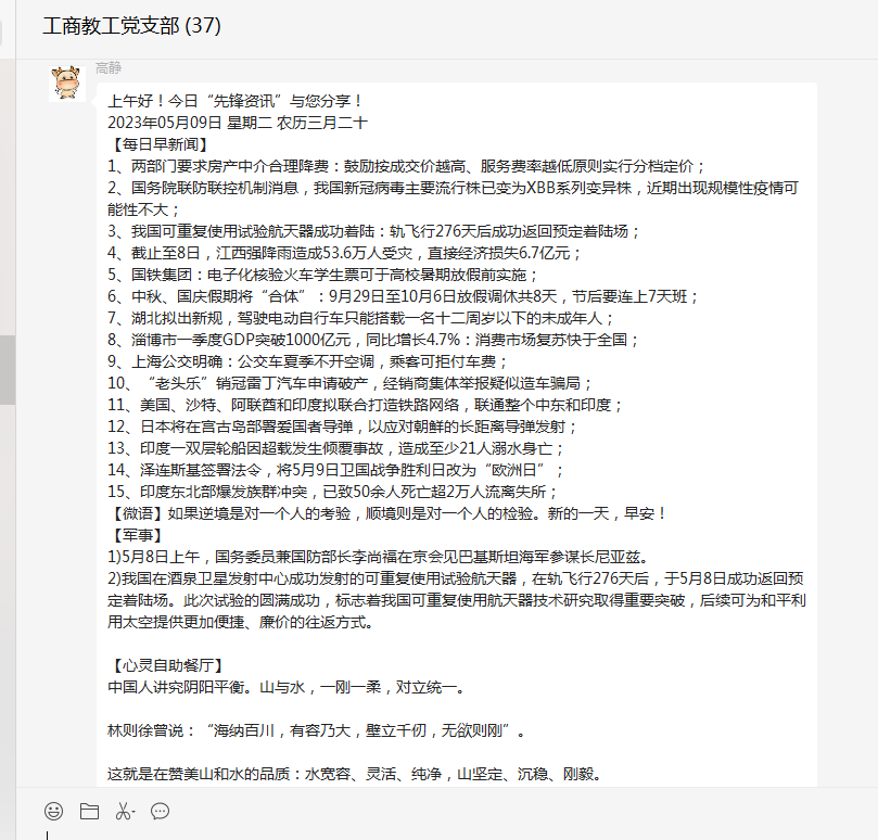 “先锋资讯”栏目包含新闻播报、心灵自助餐厅、党务百科等板块内容。让全体党员以快捷方式知晓天下新闻,心灵适时得到净化和引领,并且充实了党课教育的内容。各个板块之间内容交互融合,形成合力,全方位提升了党员老师的综合素质。此活动以微信群为载体,要求大家每天打卡学习,使得党员老师可以时刻关注活动的最新进展,学到先进的典型经验。通过互动学习,相互交流,激发了全体党员的学习热情。大家纷纷表示一定要用系统观念,在一体推进上持续用力,把学习和实干结合起来,推动taptap体育官网入口的工作走向高质量发展的新阶段。(编辑:景勤娟 审核:韩晓霞)