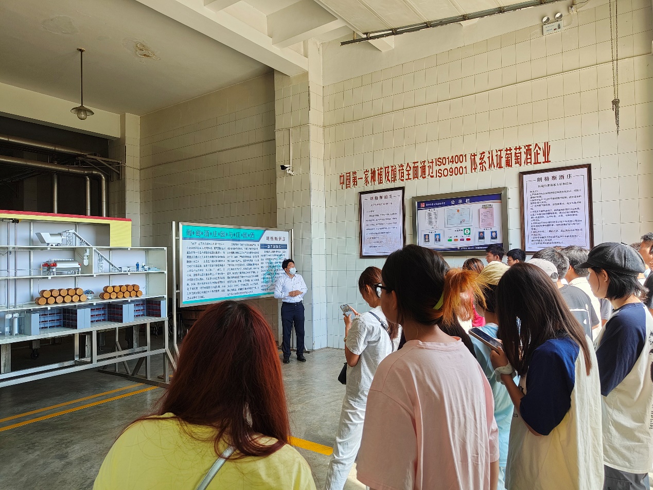 在酒庄的酿酒车间,学生们听营销顾问介绍了葡萄酒从原料到成品的完整蜕变过程。从葡萄的采摘、压榨、发酵,到陈酿、调配、装瓶,每一步都凝聚着酿酒师的匠心独运。酒庄的营销顾问向学生们详细介绍了酿酒的各个环节,包括不同酿酒工艺对葡萄酒风味的影响,以及如何通过科学管理和技术创新提升产品质量。学生们深刻感受到,酿酒工艺不仅是传统技艺的传承,更是现代科技的应用与创新。