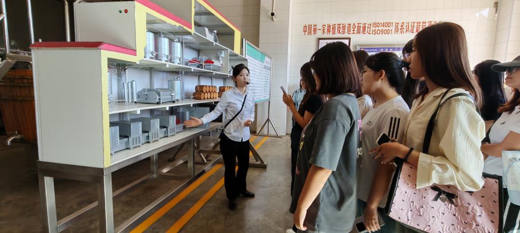 917上午,师生们还参观了位于昌黎县碣石山产区的朗格斯酒庄。酒庄讲解员向同学们讲述了朗格斯名字的由来、酒庄的发展历史与概况。同学们依次参观了葡萄酒的生产加工车间、蕴藏陈酿的地下酒窖,了解了酒庄从葡萄有机栽培、自然重力酿造法到独具特色的葡萄酒文化。朗格斯酒庄自1999年创立以来,始终坚持高标准建设与精细化运营,其美好酝酿、自然品味的理念以及在对产品品质不懈追求过程中体现出的人文关怀,给同学们留下了深刻印象。