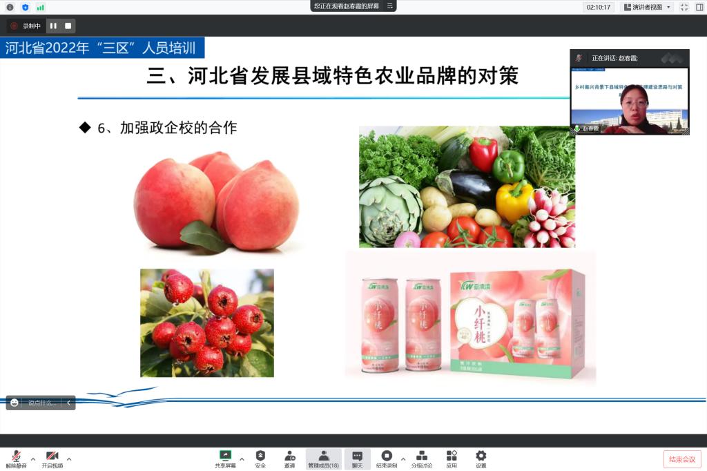2022年11月18日,taptap体育官网市场营销教学部专业带头人赵春霞博士受邀为taptap体育官网承办的“河北省2022年三区科技人员培训班”进行了“乡村振兴背景下县域特色农业品牌建设思路与对策”的线上讲座。