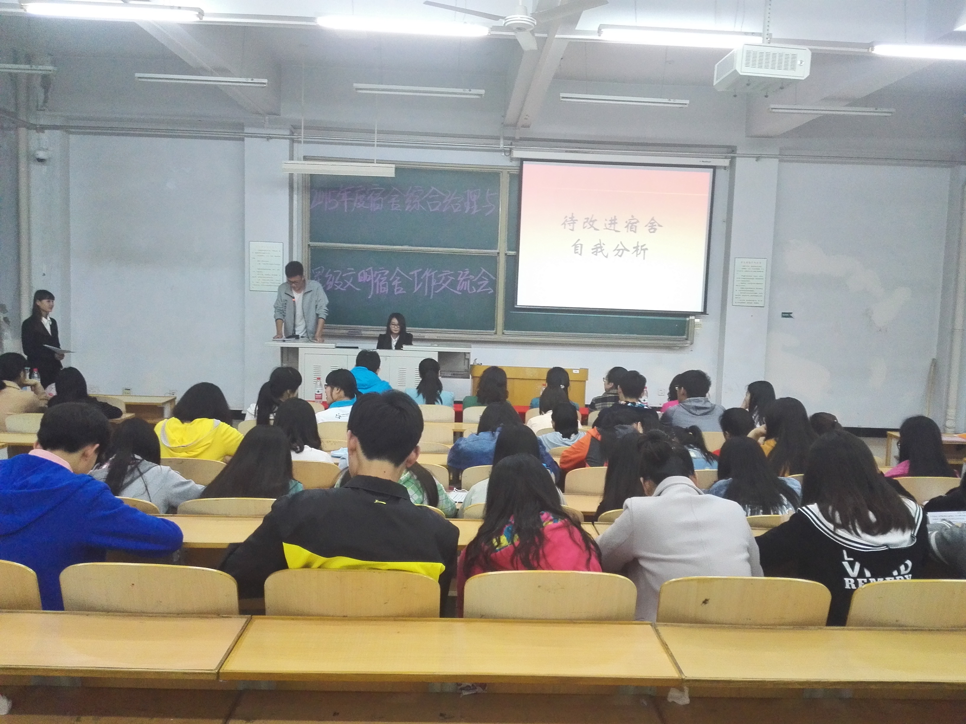 首先为同学们播放了一段视频,带我们走入taptap体育官网入口的宿舍综合治理中。交流会分为六个环节进行,通过优秀宿舍交流心得、学生公寓综合治理先进班集体的经验交流及待改进宿舍自我分析,让同学们了解到优秀宿舍的工作方法,也展示出taptap体育官网学生公寓综合治理工作的初步成效。