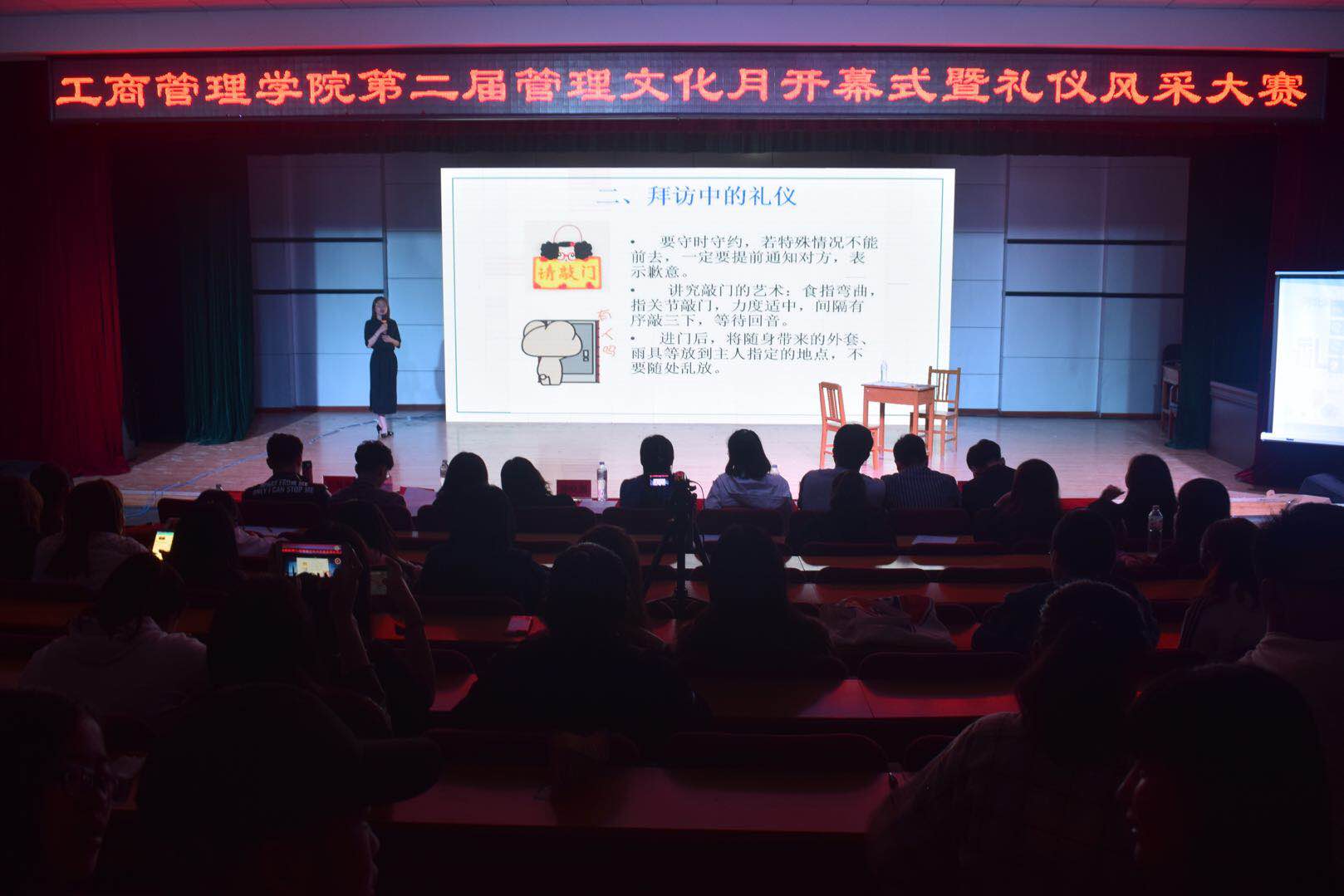 2018年5月8日,taptap体育官网入口于多功能厅举办第二届管理文化月开幕式暨礼仪风采大赛决赛,学院领导、学工办全体老师及300余名学生参加了此次活动。